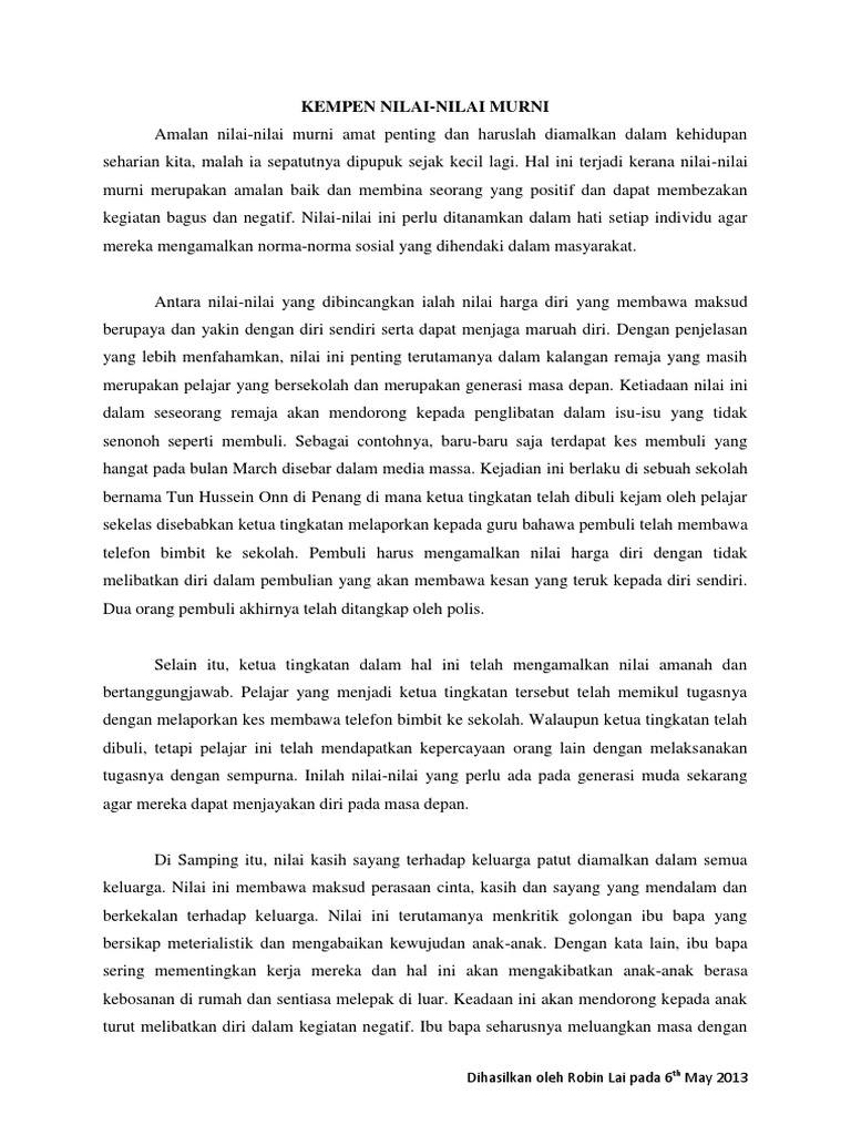 Related : Nilai-Nilai Murni Yang Perlu Diamalkan Oleh Rakyat Malaysia : Nilai nilai ini perlu dihayati oleh setiap individu untuk kecemerlangan diri dan interaksinya kpd orang lain..