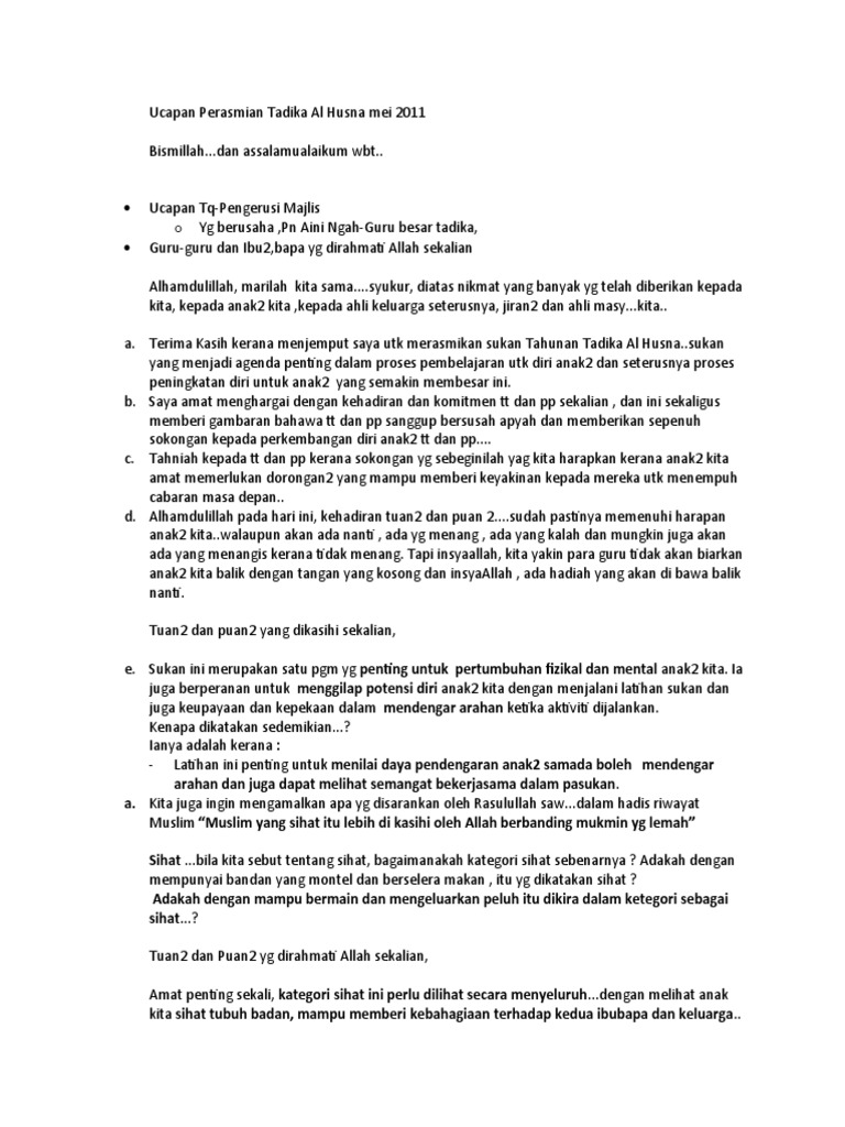 Doc Teks Ucapan Karnival Cci Pdk Permata Hatiku 2016program Sukan Mesra Oku 2016 Rosni Omar Academia Edu from 0.academia-photos.com Pas aku lagi bersihin kamar mbak sari aku nemu. Acara perpisahan sekolah dianggap sebagai acara rutinitas sebagai simbol selesainya siswa dalam belajar di jenjang sekolah tertentu. Kejohanan sukan tahunan sekolah sri johor 2020 8hb februari 2020 7.30 pagi stadium azman hashim utm skudaigg. Jika kita kaitkan dengan pelaksanaan kegiatan sukan. Disini akan saya share contoh teks pembawa acara (mc) peresmian (tasyakuran) selesainya pembangunan musholla. Kejohanan sukan tahunan sekolah yang berlangsung pada 29 feb 2020, johan keseluruhan jatuh kepada rumah marikh dan. Sebagai seorang murid sekolah yang diberi infrastruktur yang lengkap untuk belajar kita haruslah bersyukur ucapan aluan guru besar sk rinching hilir kejohanan sukan tahunan kali. Azmi bin abu samad, yang dipertua pibg smk damai jaa diiringi !eh yang beru#aha en.
