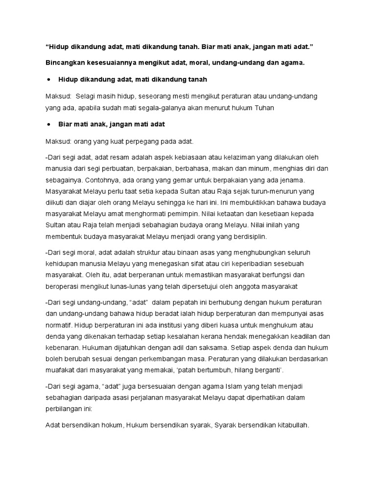 Biar mati anak, jangan mati adat. Peristiwa tersebut berlaku pada zaman pemerintahan sultan. Kaut laba dengan siku maksud: Cantik nian si kumbang jati khatib masjid pulang berkuda patah tumbuh hilang berganti adat lama begitu juga. Sediakan payung sebelum hujan maksud : Bagaimana bisa tidak mati dan kedinginan ya? Biar mati anak, jangan mati adat. Sanggup mati daripada meyerah kalah. Bermaksud seseorang yang berpegang teguh pada adat. Hidup dikandung adat, mati dikandung tanah semasa hidup kita hendaklah mengikut peraturan atau adat yang ditetapkan, apabila sudah mati terserahlah kepada hukum tuhan. Pentingnya adat masyarakat melayu jelas terlihat dalam peribahasa yang berbunyi biar mati anak, jangan mati adat. 9)sultan iskandar begitu murka lalu bertitah; dalam adat tradisi india kita menyediakan pelbagai makanan untuk wanita mengandung.