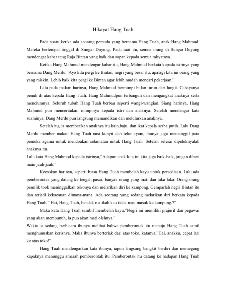 حکاية هڠ تواه) is a malay work of literature that tells the tale of the external linksedit. The protagonist, hang tuah, is the nonpareil of culture heroes. Hikayat hang tuah (rumi) uploaded by. Hikayat hang tuah is an epic litarary work describes the greatness of malay civilization, which can be taken as a lesson to the whole malay And 5) austroasiatic (via the orang asli of the.