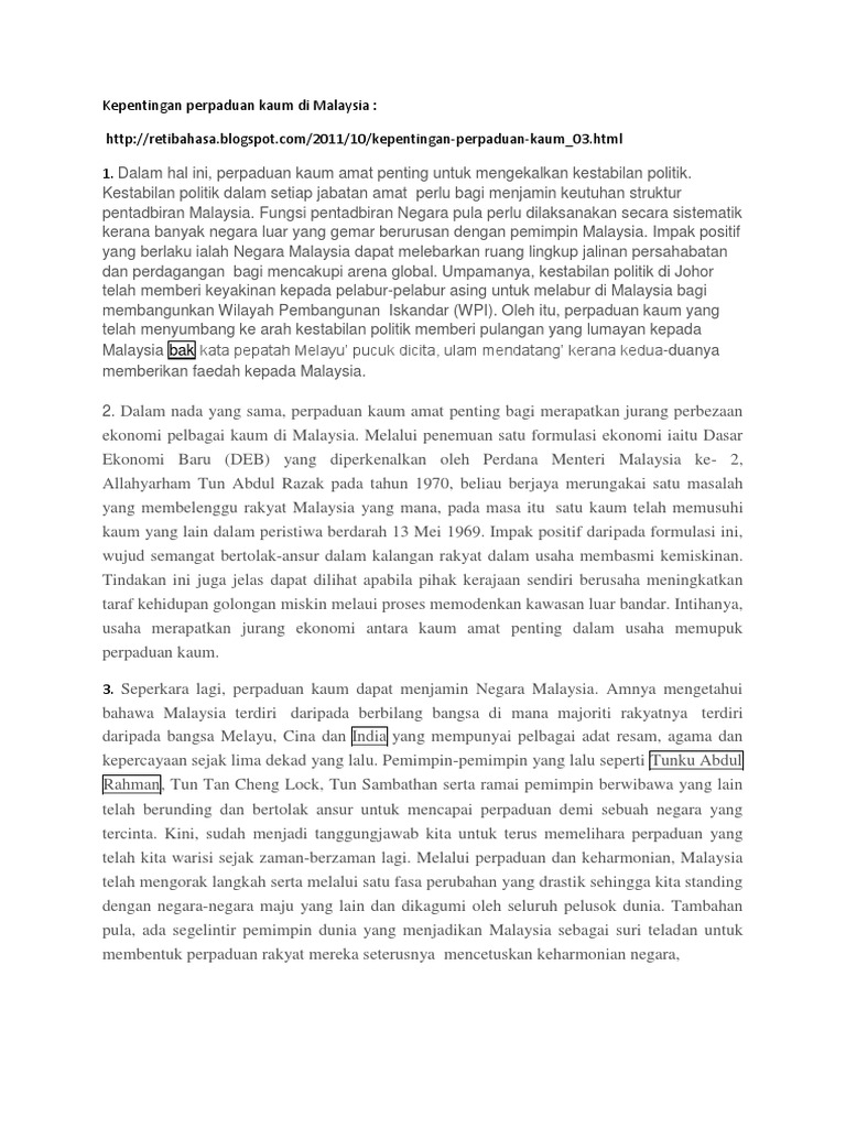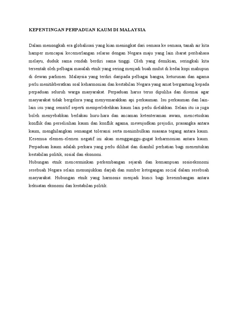 Doc Kepentingan Perpaduan Kaum Yassvind Raja Academia Edu from 0.academia-photos.com Maksud perpaduan kaum ialah semua kaum di dalam sesebuah negara saling berkerjasama atau erti kata yang lain berganding bahu untuk membentuk negara di malaysia, bahasa melayu mengalami perubahan nama beberapa kali. Kita, seluruh rakyat malaysia harus bersama memelihara dan memupuk perpaduan kaum. Tidak dapat dinafikan bahawa antara sebab utama pelabur asing berani menanam modal di sesebuah negara adalah kerana kestabilan politik dan perancangan kerajaan yang mesra pelabur. Berikan pendapat anda mengenai kepentingan perpaduan kaum di negara tercinta. Amnya mengetahui bahawa malaysia terdiri daripada berbilang bangsa di mana. By umizah khamis 39688 views. Antara kepentingan perpaduan kaum di malaysia ialah mewujudkan masyarakat yang harmoni. Di samping itu, perpaduan kaum juga secara tidak langsung mampu mengukuhkan ekonomi negara.